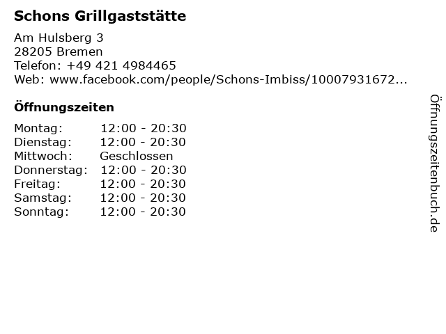 | Öffnungszeiten Schons Grillgaststätte in Bremen anzeigen | |