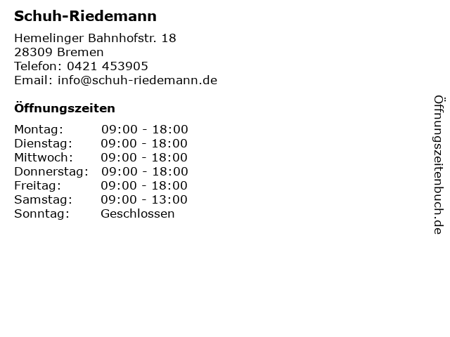 | Öffnungszeiten Schuh-Riedemann in Bremen anzeigen | |