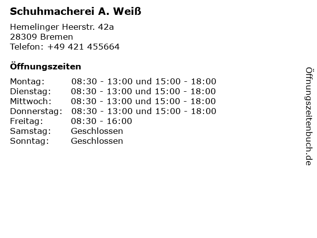 | Öffnungszeiten Schuhmacherei A. Weiß in Bremen anzeigen | |