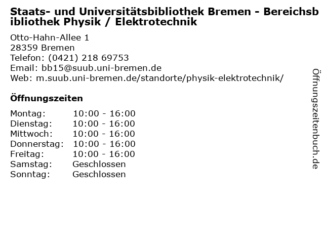 1 Staats- und Universitätsbibliothek Bremen - Bereichsbibliothek Wirtschaft (Entfernung: 0,29 km) Max-von-Laue-Str. 1, 28359 Bremen 6 Universität Bremen - Staats- und Universitätsbibliothek (Bereichsbibliothek Physik / Elektrotechnik) (Entfernung: 0,75 km) Otto H. Allee -, 28359 Bremen |