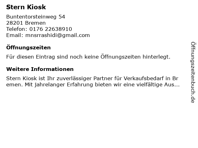 | Öffnungszeiten Stern Kiosk in Bremen anzeigen | |
