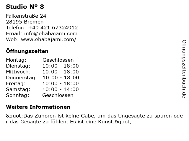 | Öffnungszeiten Studio Nº 8 in Bremen anzeigen | |