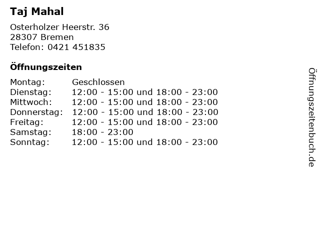 | Öffnungszeiten Taj Mahal in Bremen anzeigen | |