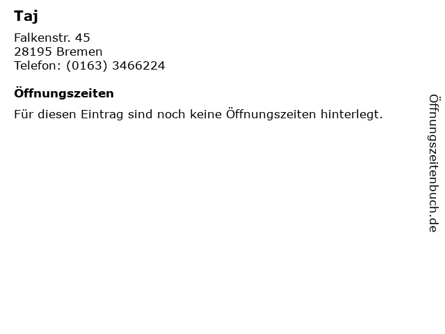 | Öffnungszeiten Taj in Bremen anzeigen | |