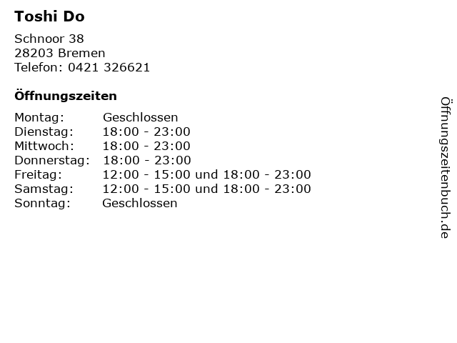 | Öffnungszeiten Toshi Do in Bremen anzeigen | |