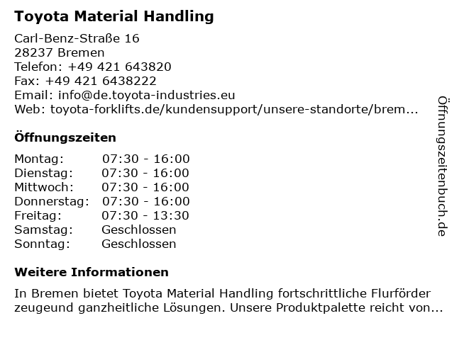 | Öffnungszeiten Toyota Material Handling in Bremen anzeigen | |