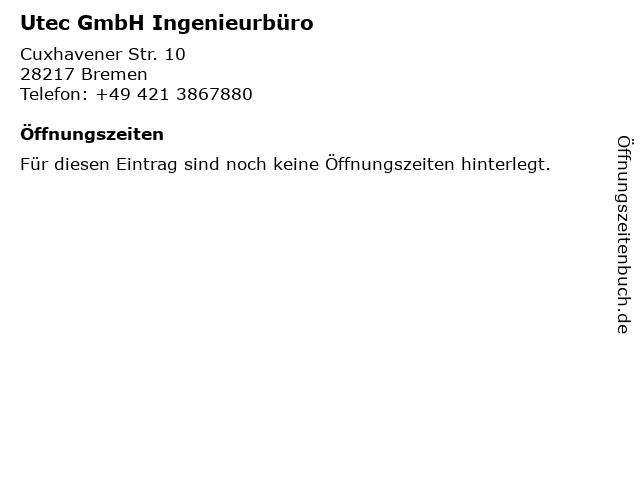 | Öffnungszeiten Utec GmbH Ingenieurbüro in Bremen anzeigen | |