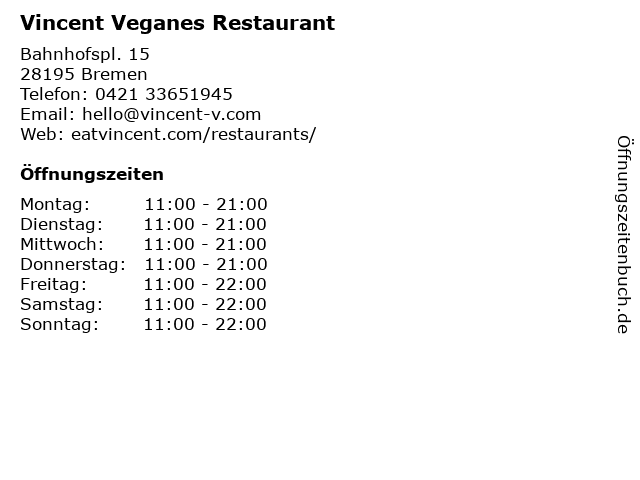 | Öffnungszeiten Vincent Veganes Restaurant in Bremen anzeigen | |