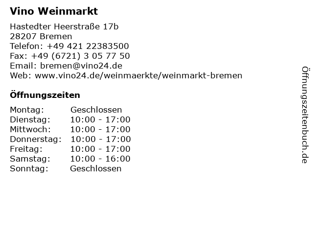 | Öffnungszeiten Vino Weinmarkt in Bremen anzeigen | |