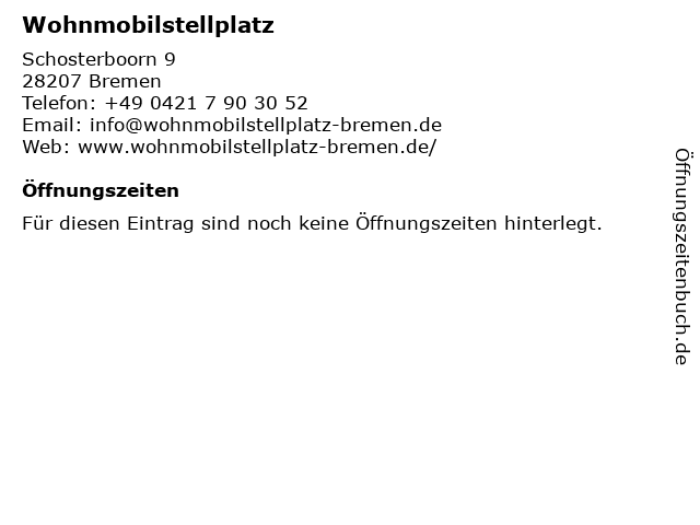 | Öffnungszeiten Wohnmobilstellplatz in Bremen anzeigen | |