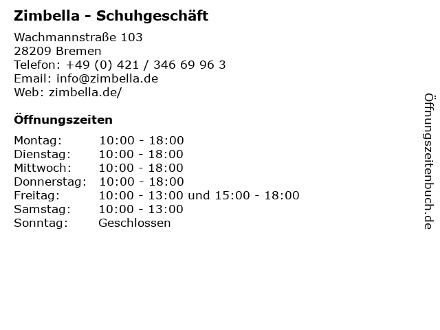 | Öffnungszeiten Zimbella - Schuhgeschäft in Bremen anzeigen | |