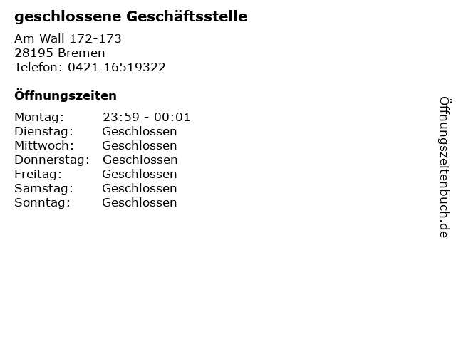 | Telefonnummer geschlossene Geschäftsstelle in Bremen (0421 16519322) anrufen | |