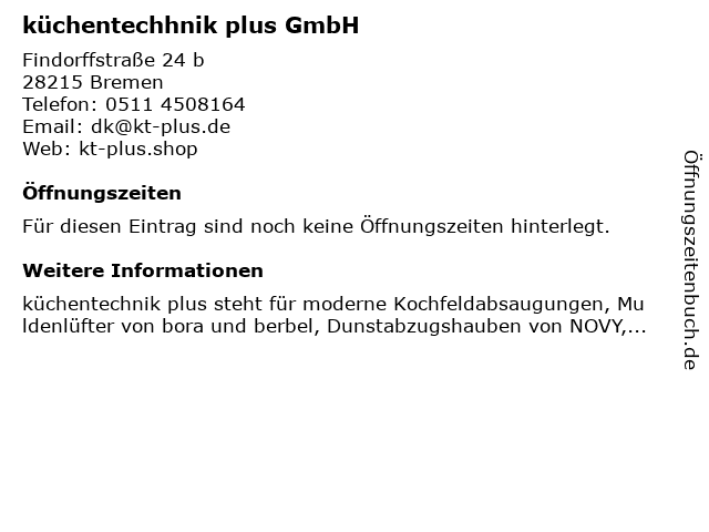 | Öffnungszeiten küchentechhnik plus GmbH in Bremen anzeigen | |