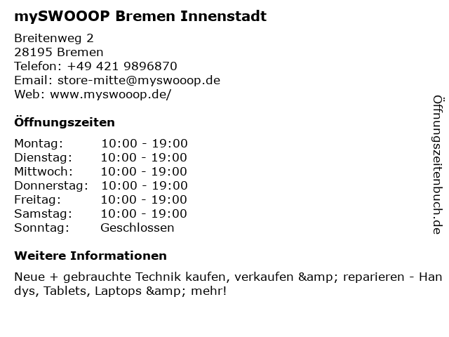 Öffnungszeiten mySWOOOP Bremen Innenstadt in Bremen anzeigen | |