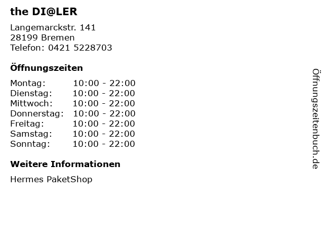 | Öffnungszeiten the DI@LER in Bremen anzeigen | |