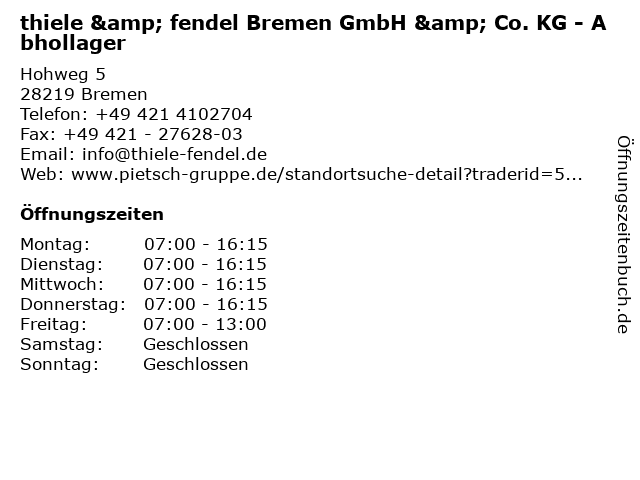 1 thiele & fendel Bremen GmbH & Co. KG - Abhollager (Entfernung: 5,34 km) Duckwitzstraße 86, 28199 Bremen 2 3 thiele & fendel Bremen GmbH & Co. KG - Abhollager (Entfernung: 10,32 km) Falkenberger Landstr. 68, 28865 Lilienthal 4 thiele & fendel Bremen GmbH & Co. KG - Abhollager (Entfernung: 11,18 km) Heidkamp 27 -29, 27721 Ritterhude 5 thiele & fendel Bremen GmbH & Co. KG - Abhollager (Entfernung: 12,07 km) Bremer Str. 51 A, 27749 Delmenhorst 6 thiele & fendel Bremen GmbH & Co. KG - Abhollager (Entfernung: 15,23 km) Margarete Steiff Str. 10, 28844 Weyhe |