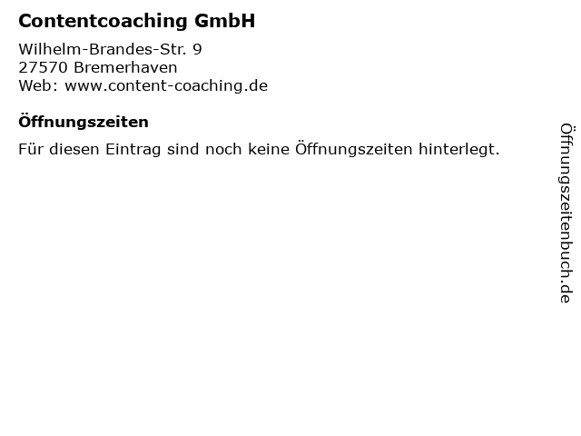 | Öffnungszeiten Contentcoaching GmbH in Bremerhaven anzeigen | |