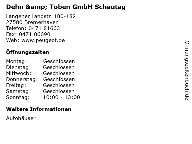 Branchen & Suchbegriffe zu Dehn & Toben GmbH Schautag:autohäuser, dehn, peugeot, schautag, toben, verkauf |