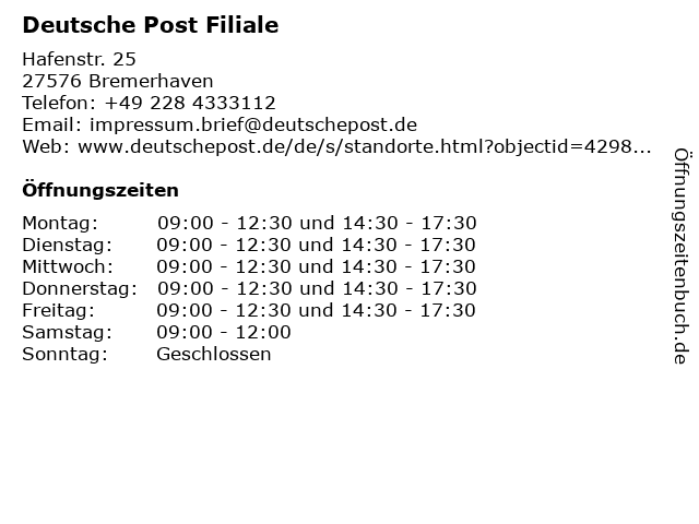 Deutsche Post Filiale in Bremerhaven: Telefonnummer, Öffnungszeiten und Adresse