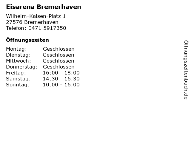 | Öffnungszeiten Eisarena Bremerhaven in Bremerhaven anzeigen | |