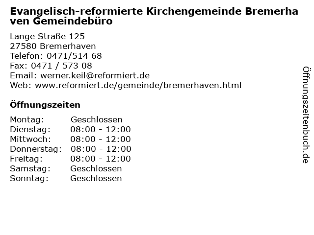 Branchen & Suchbegriffe zu Evangelisch-reformierte Kirchengemeinde Bremerhaven Gemeindebüro:evangelisch, gemeinde, gemeindebüro, gottesdienst, kirche, kirchengemeinde, pfarrer, reformierte, samtgemeinde |