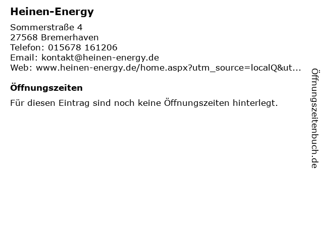 | Öffnungszeiten Heinen-Energy in Bremerhaven anzeigen | |