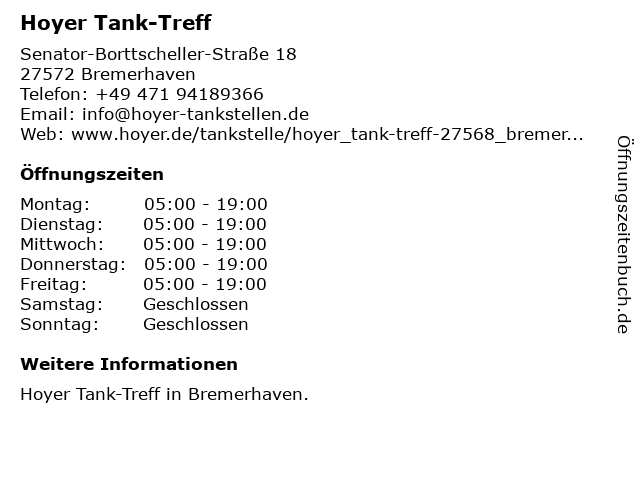 | Öffnungszeiten Hoyer Tank-Treff in Bremerhaven anzeigen | |