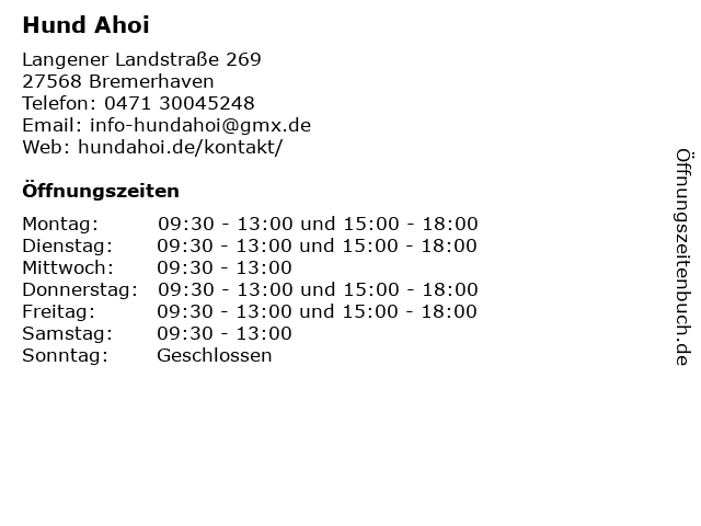| Öffnungszeiten Hund Ahoi in Bremerhaven anzeigen | |