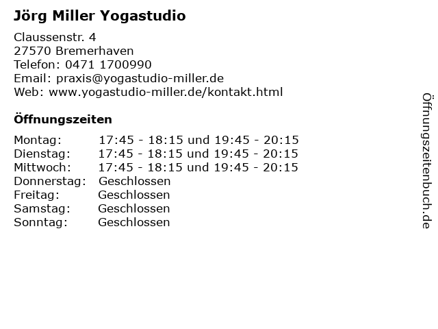 | Öffnungszeiten Jörg Miller Yogastudio in Bremerhaven anzeigen | |