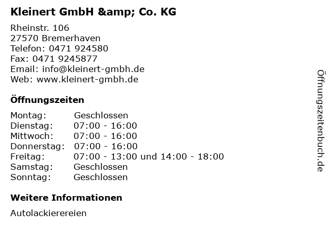 | Öffnungszeiten Kleinert GmbH & Co. KG in Bremerhaven anzeigen | |