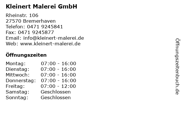 | Öffnungszeiten Kleinert Malerei GmbH in Bremerhaven anzeigen | |