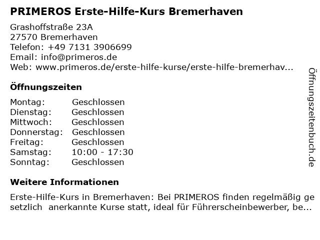 Branchen & Suchbegriffe zu PRIMEROS Erste-Hilfe-Kurs Bremerhaven:erste, erste hilfe am unfallort, erste hilfe kurs, erste-hilfe, erste-hilfe-kurs, führerschein sehtest, herz-lungen-wiederbelebung, herzinfarkt, hilfe, kurs, primeros, schlaganfall, stabile seitenlage, verbandmaterial, weiterbildung |