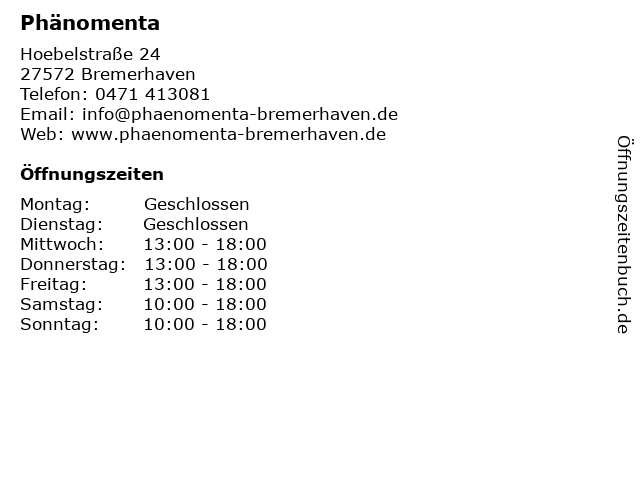 | Öffnungszeiten Phänomenta in Bremerhaven anzeigen | |