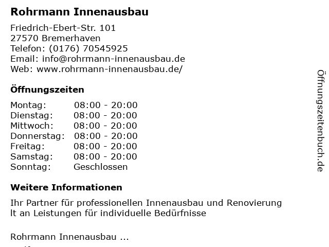 | Öffnungszeiten Rohrmann Innenausbau in Bremerhaven anzeigen | |