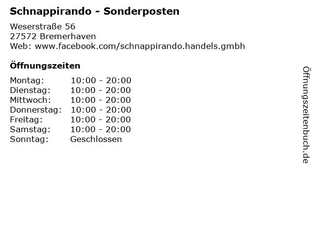 | Öffnungszeiten Schnappirando - Sonderposten in Bremerhaven anzeigen | |