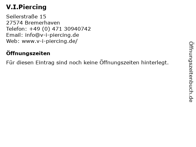 | Öffnungszeiten V.I.Piercing in Bremerhaven anzeigen | |