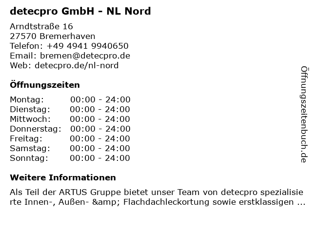 | Öffnungszeiten detecpro GmbH - NL Nord in Bremerhaven anzeigen | |