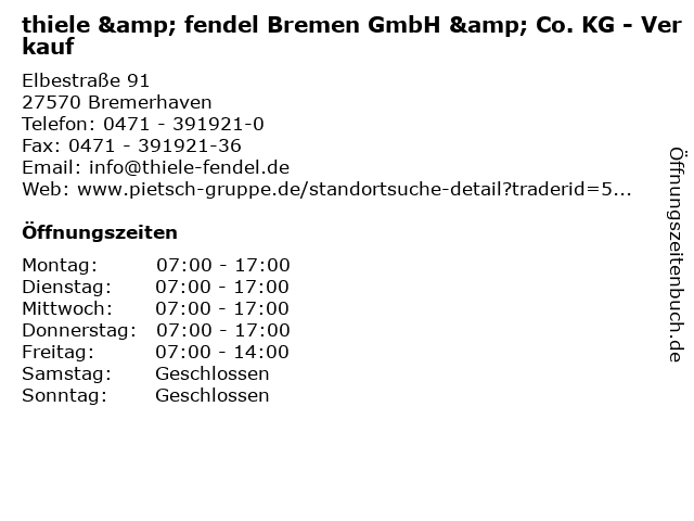 1 thiele & fendel Bremen GmbH & Co. KG - Abhollager (Entfernung: 0,00 km) Elbestraße 91, 27570 Bremerhaven 6 |