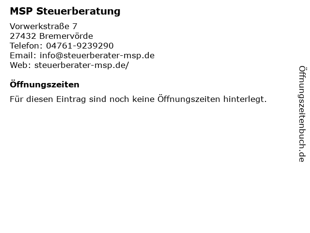 | Öffnungszeiten MSP Steuerberatung in Bremervörde anzeigen | |