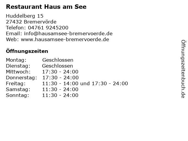| Öffnungszeiten Restaurant Haus am See in Bremervörde anzeigen | |