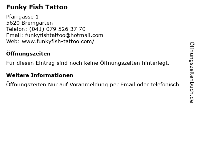 | Öffnungszeiten Funky Fish Tattoo in Bremgarten anzeigen | |