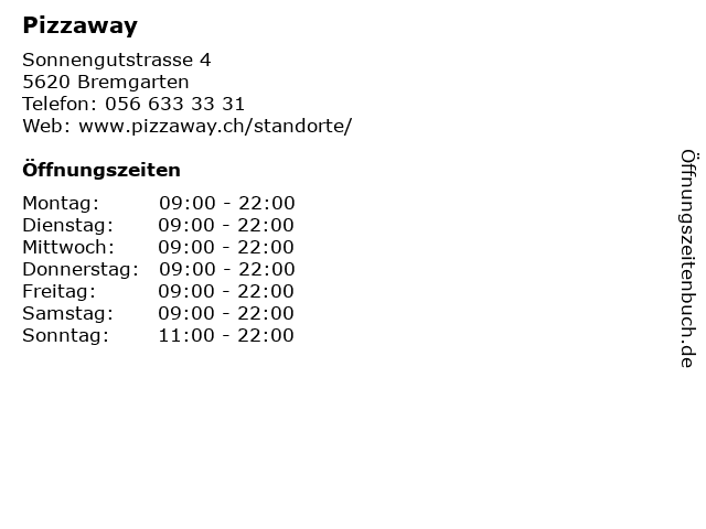 | Öffnungszeiten Pizzaway in Bremgarten anzeigen | |