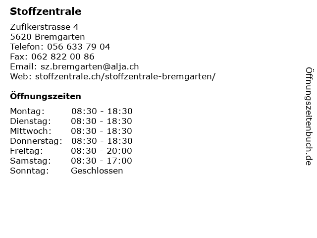 | Öffnungszeiten Stoffzentrale in Bremgarten anzeigen | |