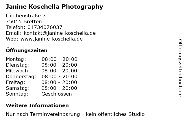 | Öffnungszeiten Janine Koschella Photography in Bretten anzeigen | |