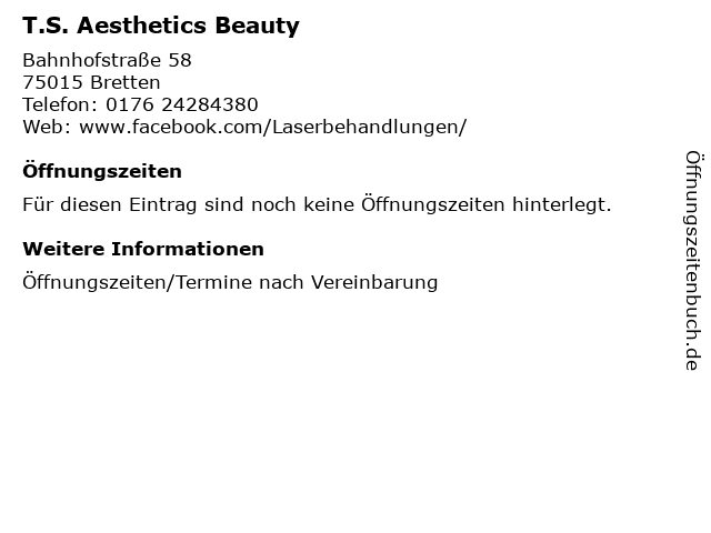 | Öffnungszeiten T.S. Aesthetics Beauty in Bretten anzeigen | |