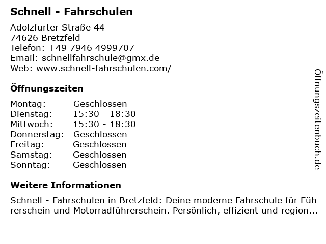| Öffnungszeiten Schnell - Fahrschulen in Bretzfeld anzeigen | |
