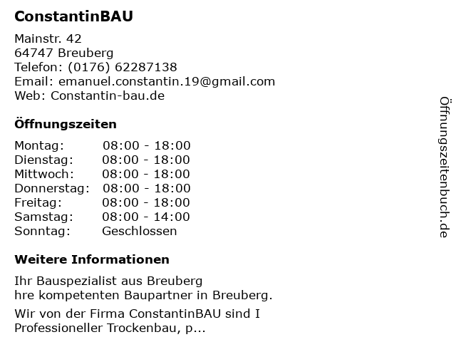 | Öffnungszeiten ConstantinBAU in Breuberg anzeigen | |