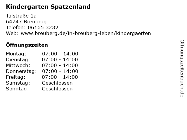 | Öffnungszeiten Kindergarten Spatzenland in Breuberg anzeigen | |