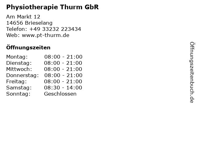 | Öffnungszeiten Physiotherapie Thurm GbR in Brieselang anzeigen | |