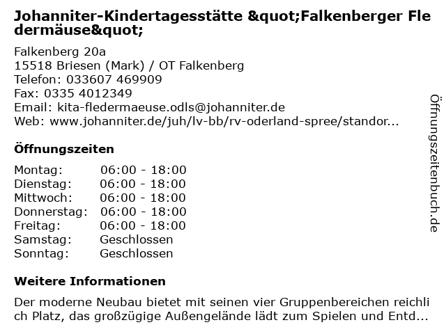 Branchen & Suchbegriffe zu Johanniter-Kindertagesstätte "Falkenberger Fledermäuse":"falkenberger, agentur für kinderbetreuung, fledermäuse", gemeinnützige organisation, hilfsorganisation, johanniter, kindertagesstätte, sozialarbeit, verband, wohlfahrtseinrichtung |